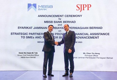 (Dari kiri) Datuk Nor Azam M. Taib dan Chen Yin Heng dalam majlis pengumuman perkongsian strategik MBSB dan SJPP di ibu pejabat bank itu di Petaling Jaya hari ini.